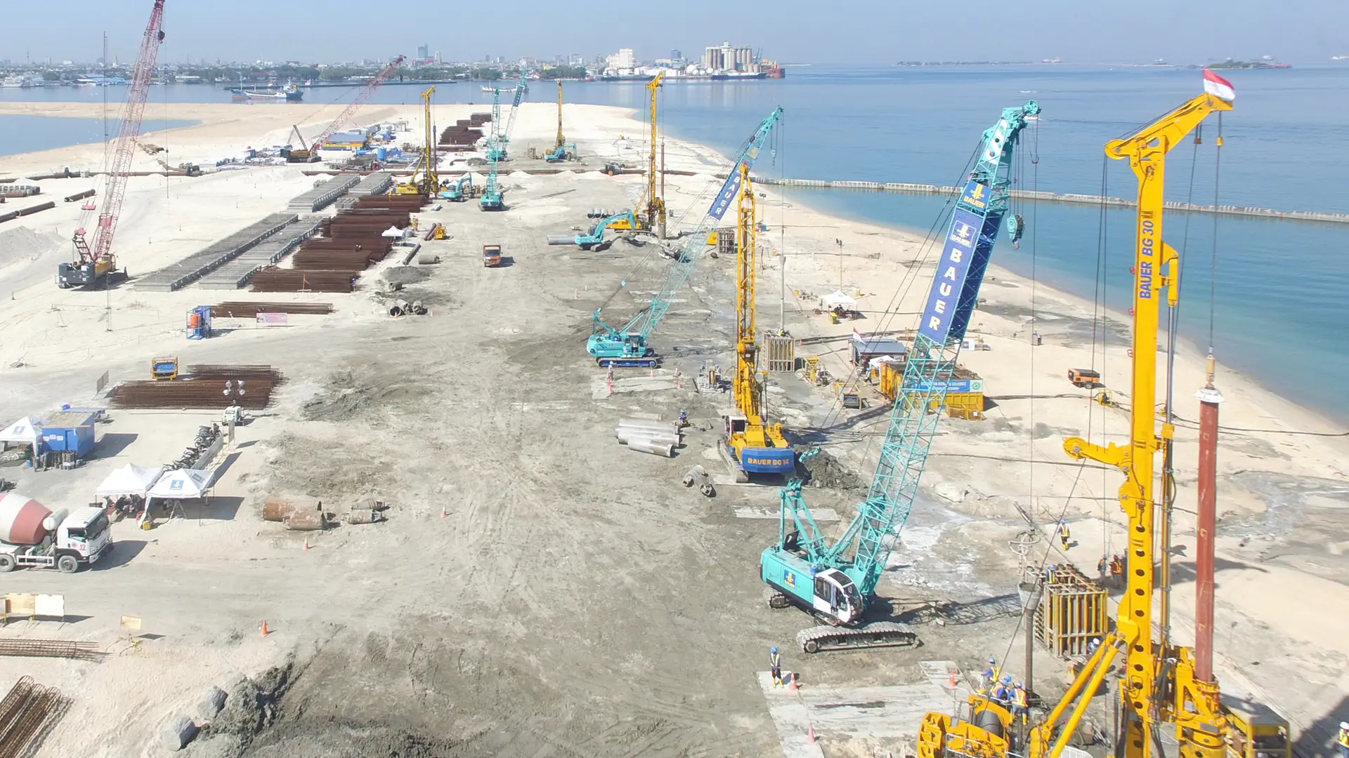 The city of Makassar is set to become a central city for eastern Indonesia. The existing port therefore needed to be expanded to support logistics traffic. To realize this project, Pelindo IV, the Indonesian port authority, planned the construction of a new port on a newly reclaimed island about 2 km off the coast of Makassar. This port has a total depth of 16 m to handle large cargo ships, making it the largest in eastern Indonesia. For the so-called 1A phase, our experts from Bauer Indonesia were commissioned for the first 500 meters. The new island was backfilled with sand and the piling works consist of 880 mm and 1180 mm diameter bored piles and 1180 mm diameter secant piles for a harbor quay wall, with an average drilling length of 28 m from ground level. Double-walled casing was used for this new island project.